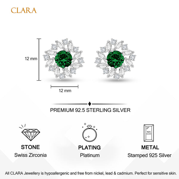 Crafted in pure 92.5% sterling silver, these elegant earrings feature a 925 stamp on each piece to signify authenticity and quality. Finished with a high-quality 2-micron platinum plating, they offer a brilliant, long-lasting shine along with enhanced durability and resistance to tarnish. Adorned with the finest quality Swiss Zirconia, the precision-cut stones deliver a radiant, diamond-like sparkle that adds timeless elegance to any look. Designed to be lightweight, skin-friendly, and comfortable for all-day wear, these earrings are perfect for both everyday styling and special occasions. Each pair comes beautifully packaged in a premium gift box along with a CLARA Authenticity Card, making it an ideal gifting choice.