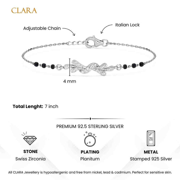 Size Adjustable Hand Mangalsutra Bracelet with Black Beads is crafted in 92.5% pure sterling silver. Every piece carries the 925 stamp, ensuring authenticity and purity. The bracelet is adorned with Swiss Zirconia stones, specially cut to match the brilliance of real diamonds. Their sparkle is so close to natural diamonds that even professionals find it hard to tell the difference with the naked eye. To enhance durability and shine, the jewellery is finished with a 2-micron-thick, nickel-free platinum plating, ensuring a long-lasting, tarnish-resistant polish. Each bracelet is thoughtfully packed in an elegant gift box and comes with a CLARA Authenticity Card, making it a perfect choice for gifting or personal wear. The size of this Hand Mangalsutra Bracelet is easily adjustable. Any woman or Girl can wear this Hand Mangalsutra Bracelet without any issue of size and fit.